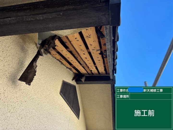 #軒天修繕 #軒天貼り替え #部分補修 #外装修理 #建物メンテナンス #防水工事 #ケイカル板 #塗装仕上げ #住宅リフォーム #外装リフォーム #雨水対策 #大工工事