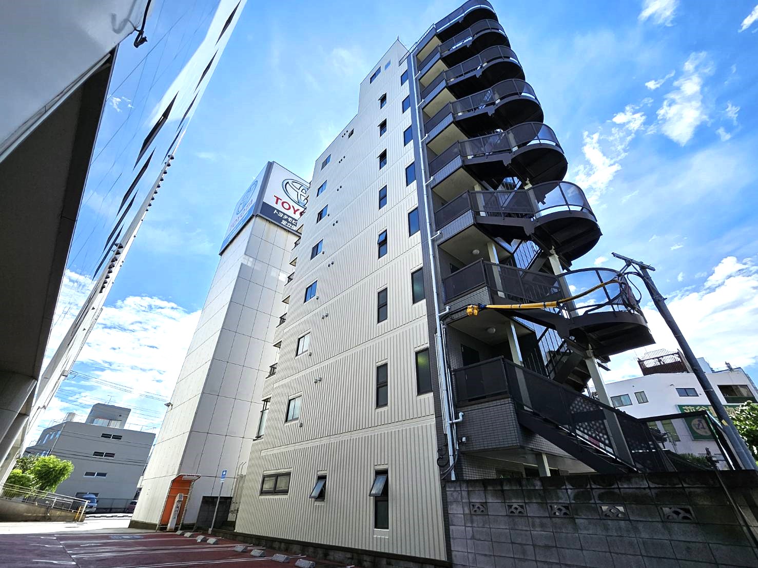 この度は、弊社にご依頼いただきまして誠にありがとうございました。8階の一面に足場を設置しましたが、台風の影響も受けることなく無事に完工いたしました。工事にご協力いただき、誠にありがとうございます。